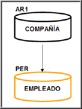 En este ejemplo, estamos mostrando una relación 1 a n entre la tabla "Compañía" y la tabla "Empleado". La razón de esto, es que una Compañía tiene varios empleados, pero en cambio un empleado pertenece a una sola compañía. La flecha va de "Compañía" a "Empleado". Se dice que un registro de "Compañía" es padre de uno o varios registros de "Empleado", y que cada registro de "Empleado" es hijo de un registro de "Compañía". Con esta nomenclatura se hace claro que un padre puede tener varios hijos, pero un hijo puede tener, a lo sumo, un solo padre, o pudiera no tenerlo. Se dice que es un registro "huérfano". |