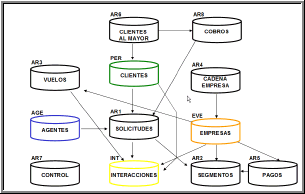 Una de las labores más importantes del Asesor es definir la estructura de tablas de la aplicción, con las relaciones entre tablas. Estas relaciones pueden ser abundantes y complejas, como las que vemos en el diagrama siguiente: