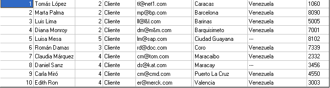 La tabla de este ejemplo tiene 10 filas y 8 columnas. Cada fila corresponde a una persona (un registro) y cada columna corresponde a un dato particular. Por ejemplo, la segunda columna contiene un nombre, la quinta un email, la sexta una ciudad, la sétima un país...