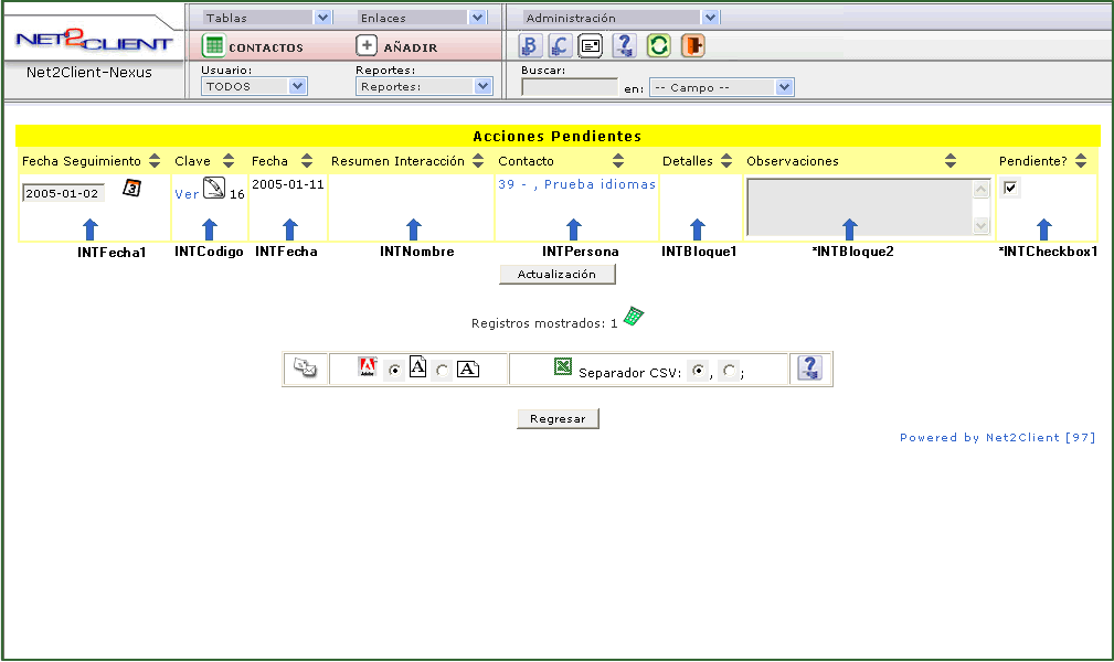 | campofecha='[nombre_campo]' | Nombre del Campo que indica la fecha en que se ingreso la acción. Es utilizada para compararla con la fecha actual y listar aquellas acciones que se encuentren pendientes. | ||