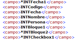 | <campo></campo> | Enmarca a los campos que componen cada línea de búsqueda, ya que un mismo criterio puede incluir varios campos de una tabla, por ejemplo puede haber un criterio compuesto por teléfono de habitación, teléfono de oficina y teléfono celular. Nótese que si el nombre del campo ubicado entre los tags se antecede por un asterisco será modificable cuando se liste. |